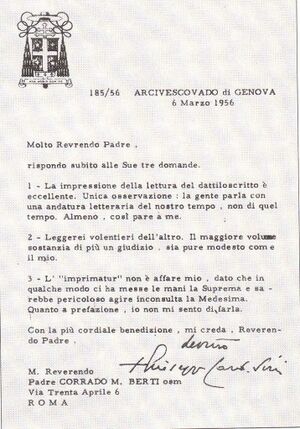 Lorsque la publication du premier volume de l’Œuvre fut imminente, le Père Berti voulut faire une dernière tentative pour obtenir un Imprimatur, ou du moins une déclaration qui puisse être, d’une certaine manière, équivalente. À cette fin, il envoya une lettre au cardinal Siri, accompagnée (semble‑t‑il[1]) d’au moins un des fascicules dactylographiés de l’Œuvre de Maria Valtorta[2].
