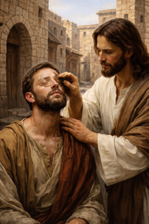 C'est l'aveugle-né de Jean 9,1-34. C'est un jeune homme de trente ans du quartier populaire d'Ophel, à Jérusalem. Il semble ne pas avoir de paupières : le front rejoint les joues sans aucune cavité et il semble que par dessous il n'y ait pas de globes oculaires. Jésus étend de la boue sur ses paupières et lui demande d'aller se laver à la fontaine de Siloé : il est guéri.